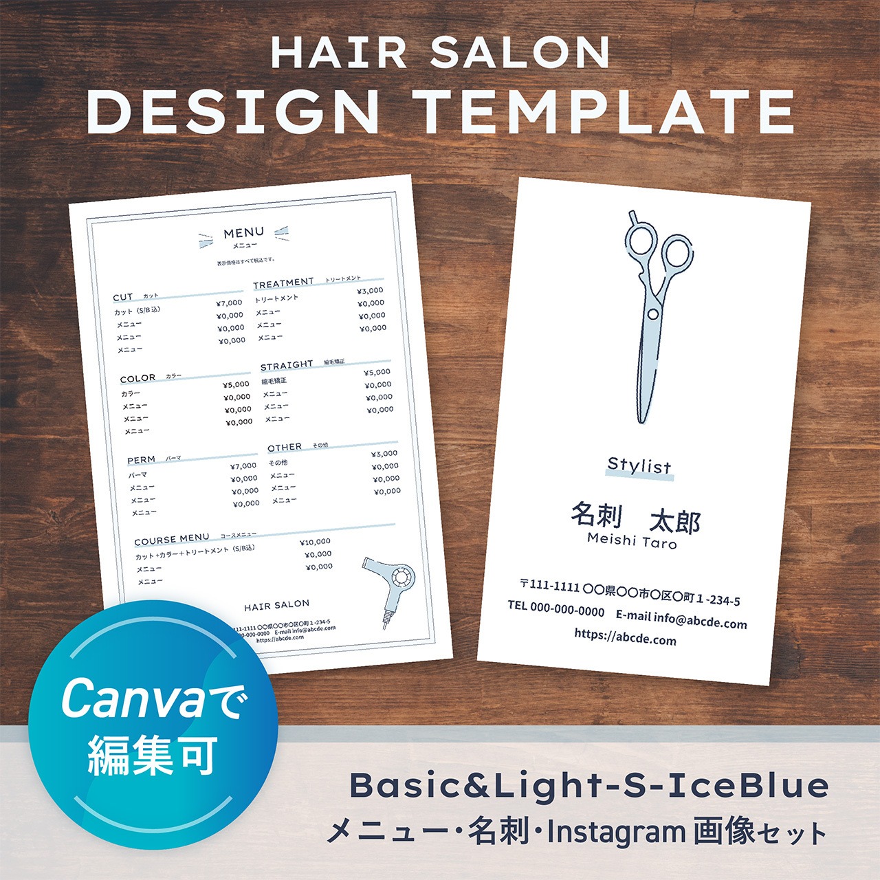 施術メニュー・名刺・Instagram投稿画像をまとめて作れる【美容室向けCanvaテンプレート】です。