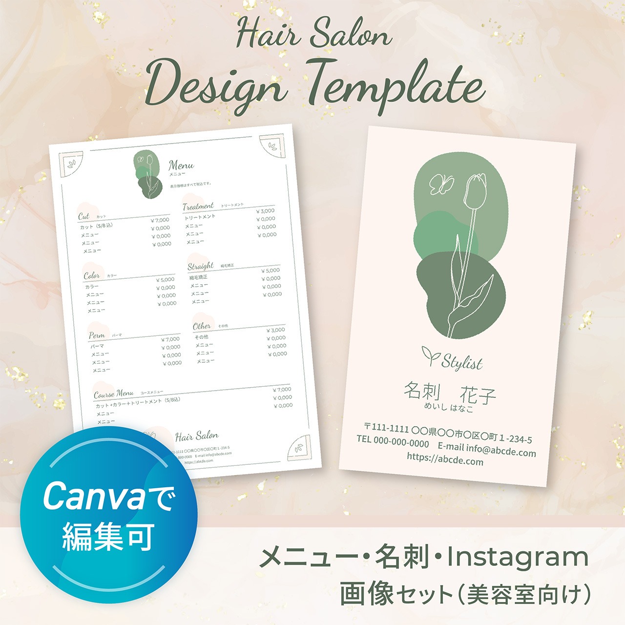 施術メニュー・名刺・Instagram投稿画像をまとめて作れる【美容室向けCanvaテンプレート】です。