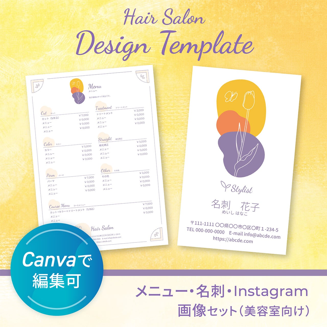 施術メニュー・名刺・Instagram投稿画像をまとめて作れる【美容室向けCanvaテンプレート】です。