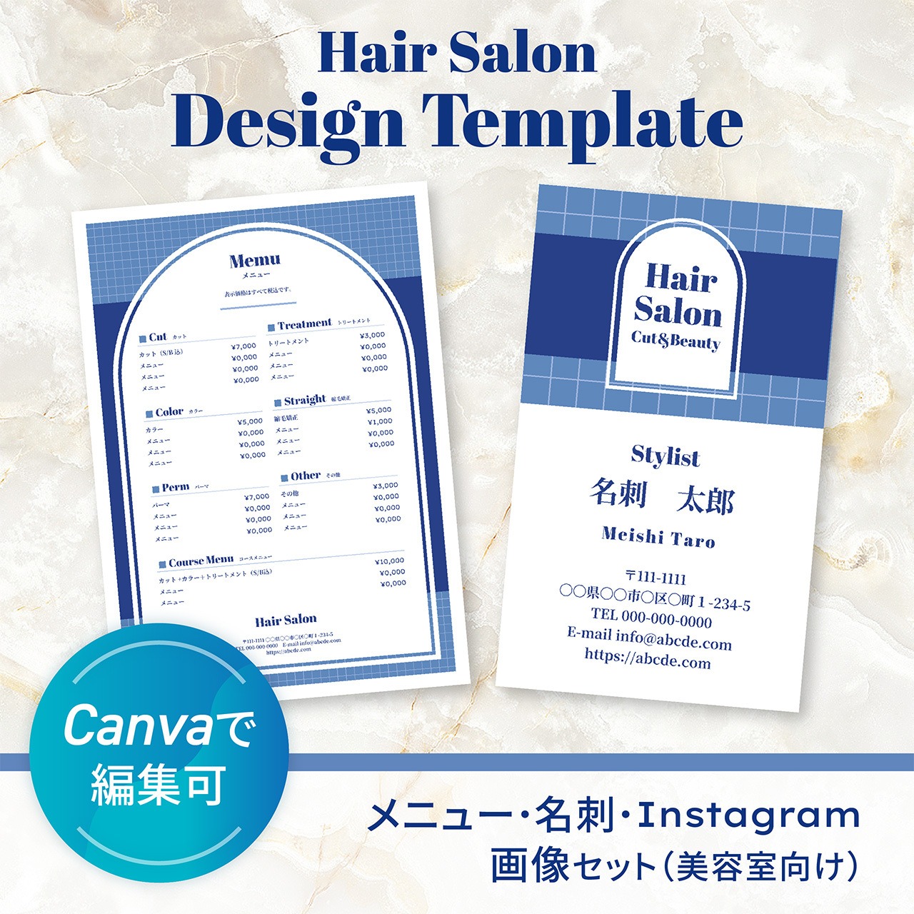 施術メニュー・名刺・Instagram投稿画像をまとめて作れる【美容室向けCanvaテンプレート】です。