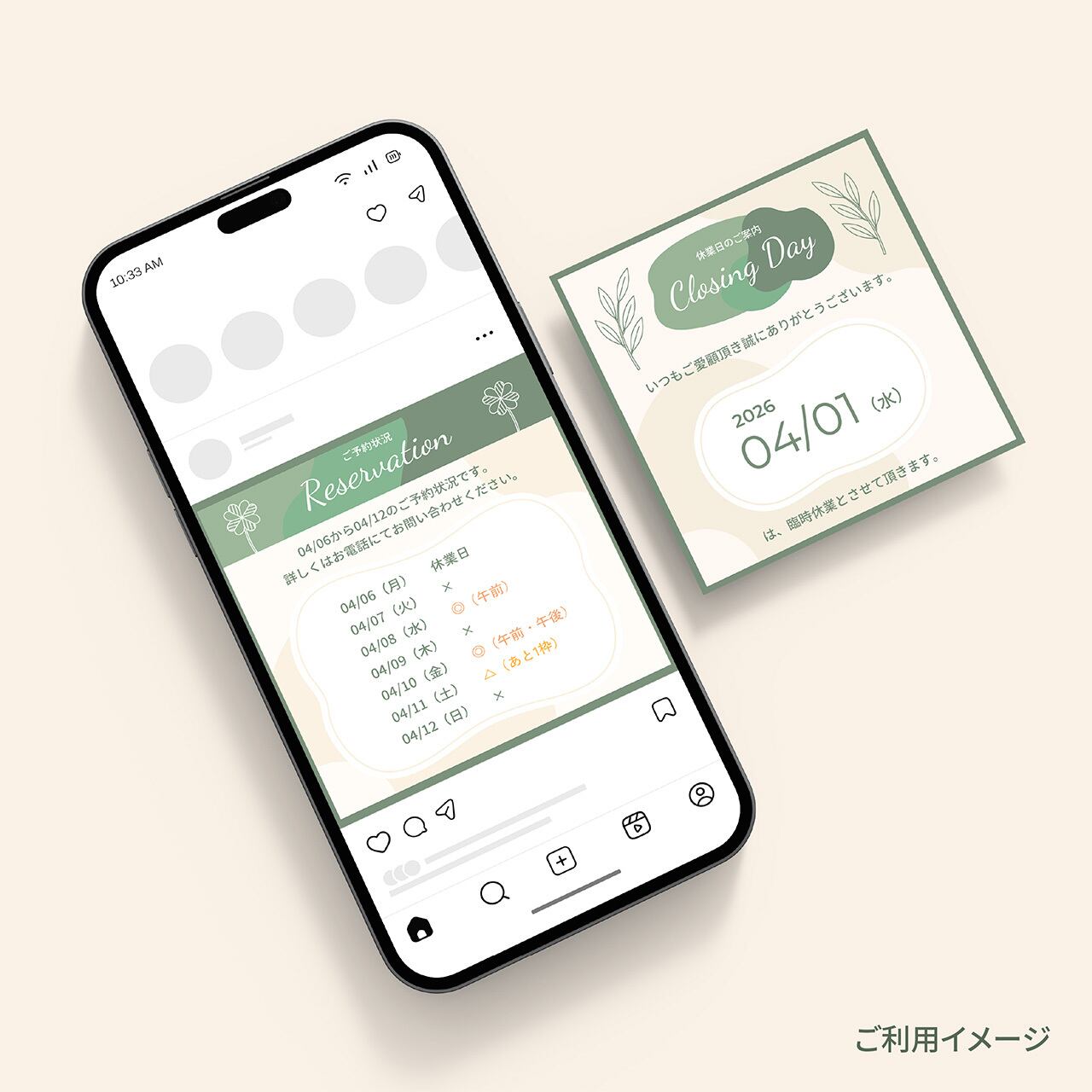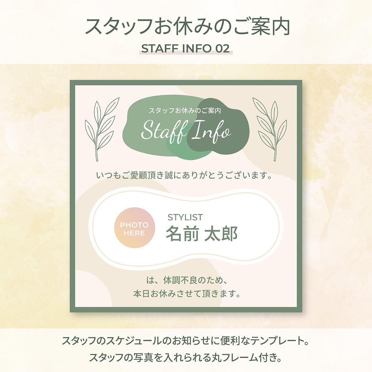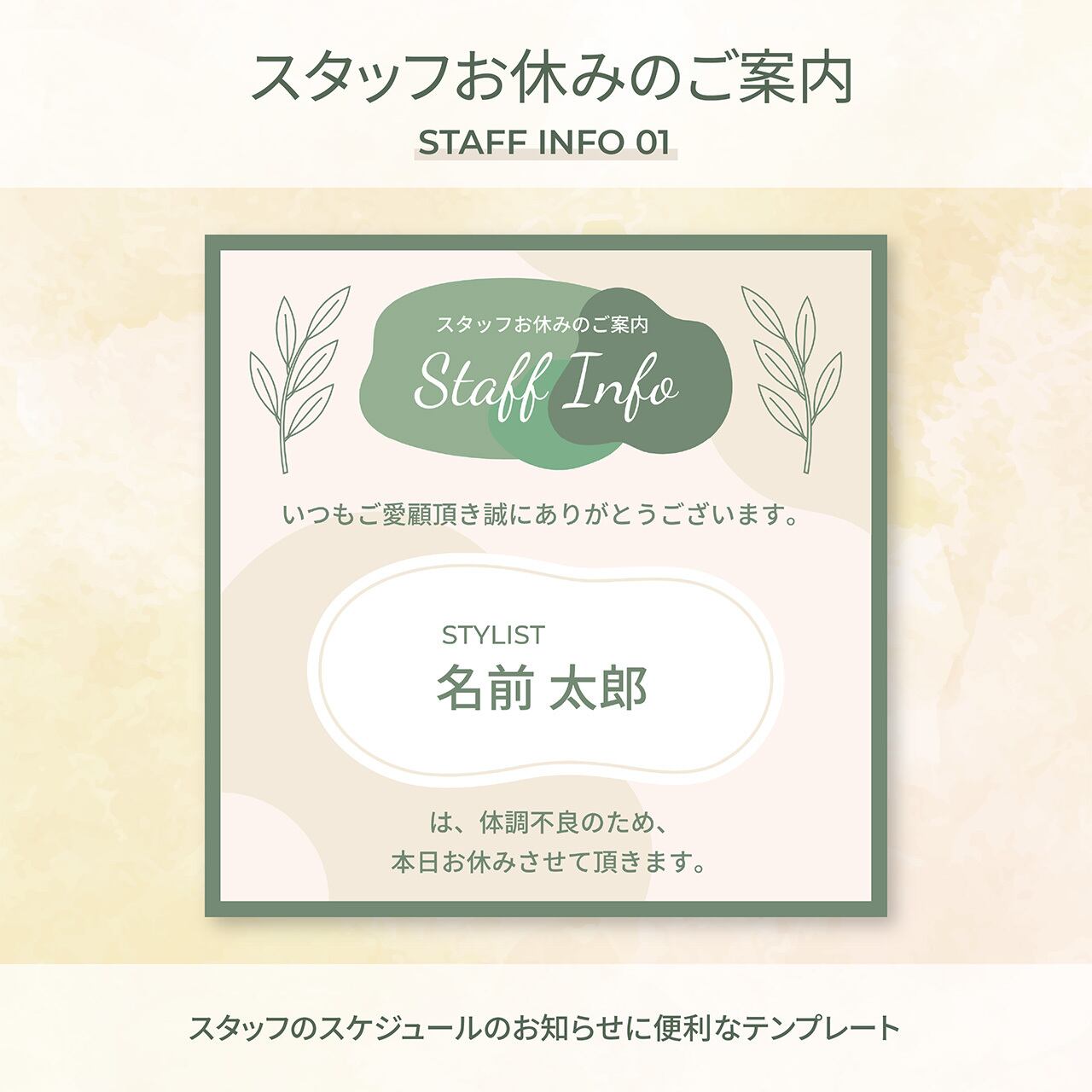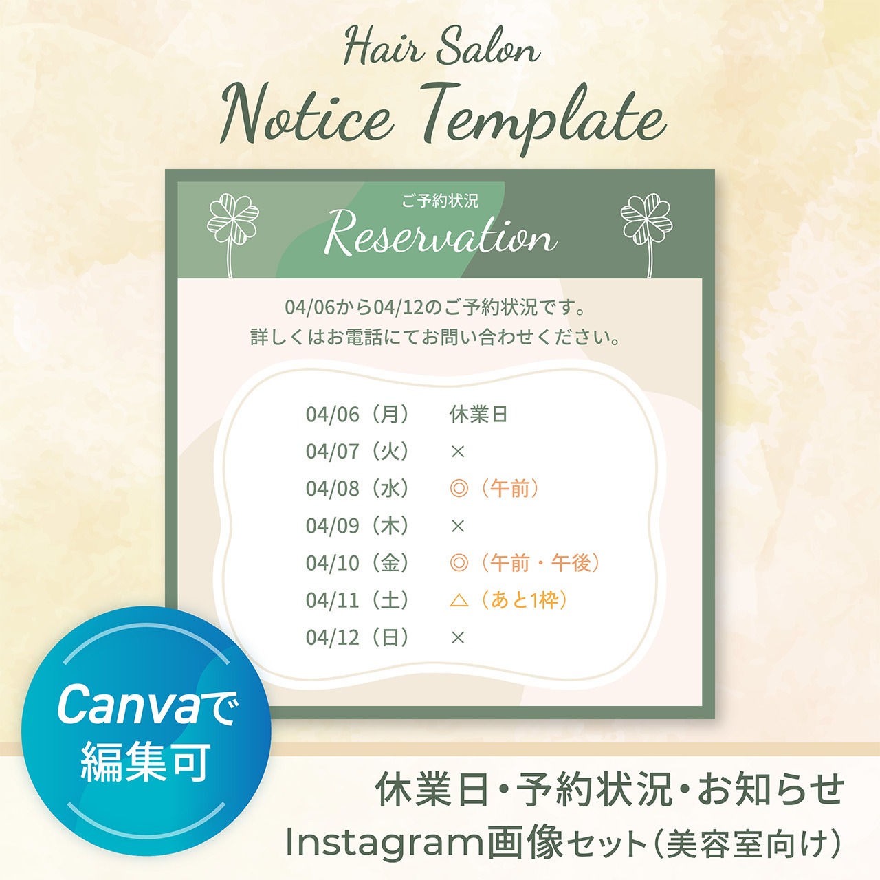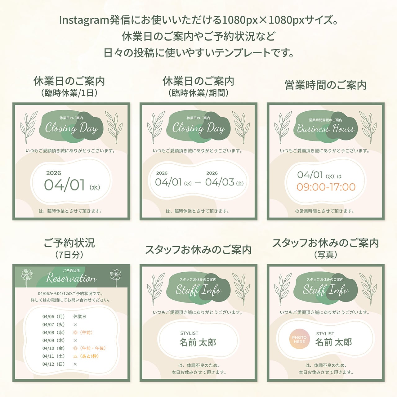「休業日・予約状況・営業時間変更」などのお知らせテンプレートです。
